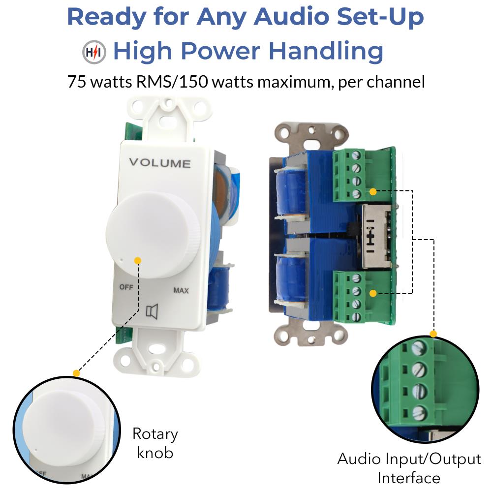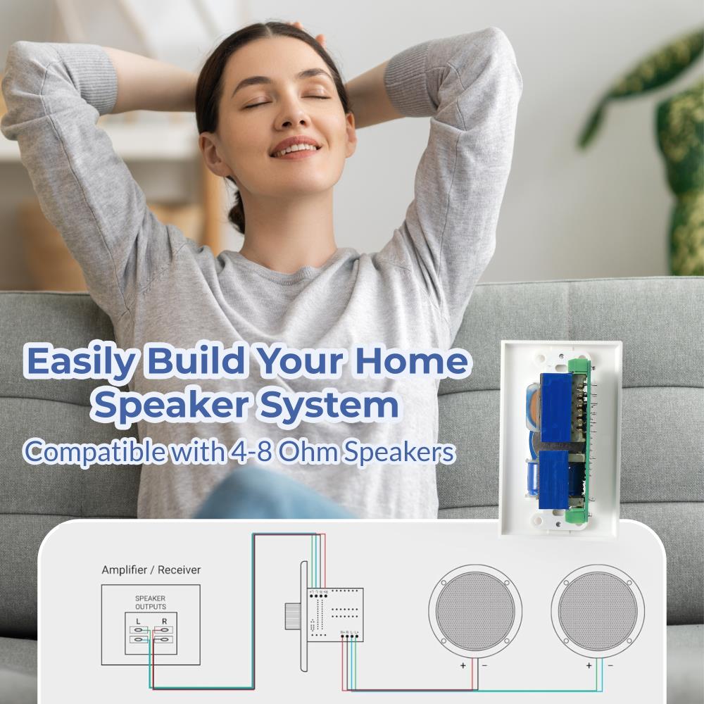 Compact and easy to install, this unit fits into any standard electrical wall box and comes with matching wallplates for a clean, professional look. It connects with standard 16–22 gauge wire and features secure screw terminals for reliable connections. Engineered to handle 50W RMS / 100W max per channel, it’s perfect for smaller speaker installations in homes, offices, or small commercial spaces.